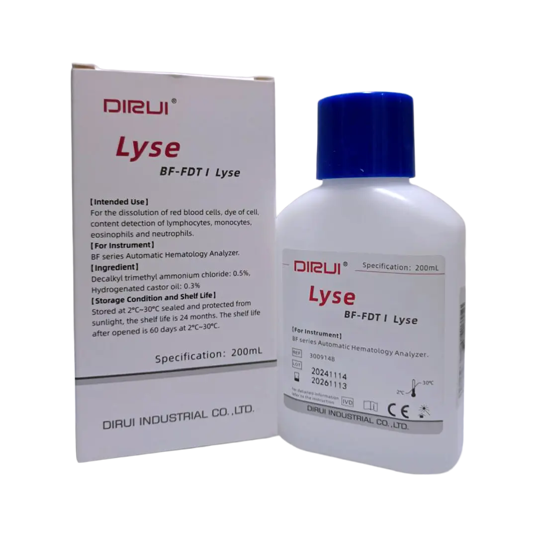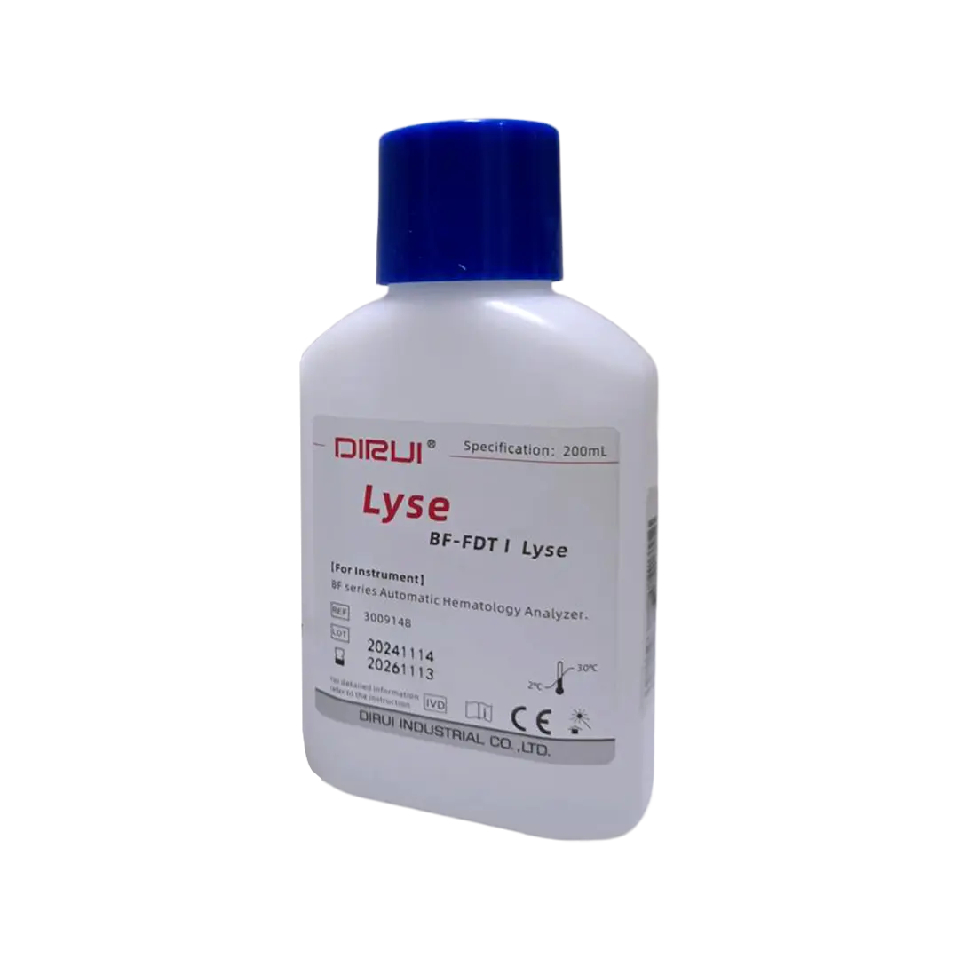 BF-FDTI Lyse is a lysing reagent for 5-diff hematology analysis using devices such as BF-6900 and BF-6960. Its primary function is to lyse red blood cells (erythrocytes), thus enabling more accurate readings of white blood cells (leukocytes) and other hematology parameters.